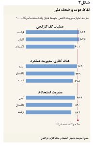مدیریت خوب توسط موقعیت جغرافیایی دیکته نمی شود، در عوض نتایج تحقیق نشان داده است که مدیریت برتر فراتر از زبان، فرهنگ و مقررات عمل می کند. اگرچه موقعیت جغرافیایی تأثیر اندکی بر گسترش عملکردهای برتر دارد، برخی کشورها در حوزه های خاصی برتری دارند. شرکتهای فرانسوی و آلمانی، در عملیات سطح کارگاه برتر هستند در حالیکه شرکتهای امریکایی در ابعاد نرم – هدفگذاری و مدیریت استعدادها- برترند (شکل شماره ۳). بخشی از این تفاوتها احتمالا ناشی از مقررات سخت بازار کار و فرهنگ کاری فرانسه و آلمان است که گزینه های مدیریت در الهامبخشي به كارکنان یا درخواست از کارکنان برای کارائی بیشتر را محدود میسازند. از آنجا که مدیران نمیتوانند برای بهره وری بالاتر به کارکنان رجوع کنند، ناچارند بر فشار بیشتر بر کارخانه و تجهیزات اتکا کنند.